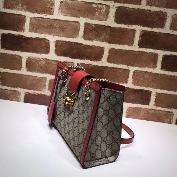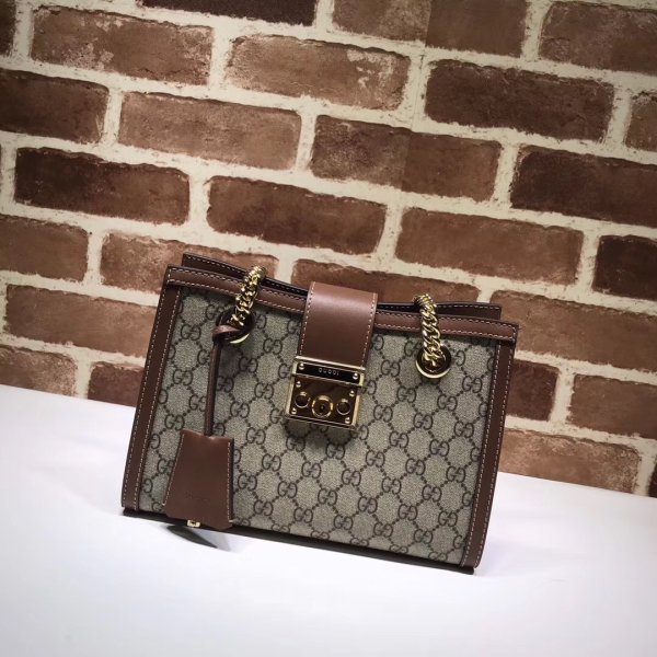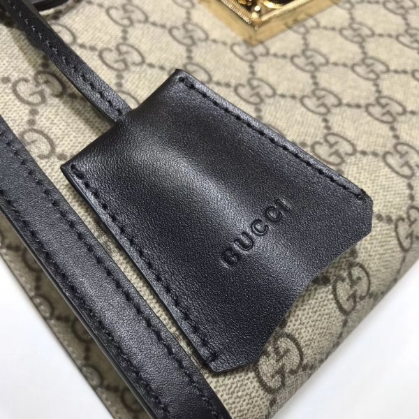 a borsa a tracolla strutturata in tela suprema GG con una cinghia che si protegge con una chiusura a lucchetto chiave tirato direttamente dagli archivi. The key is placed in a detachable leather key case.